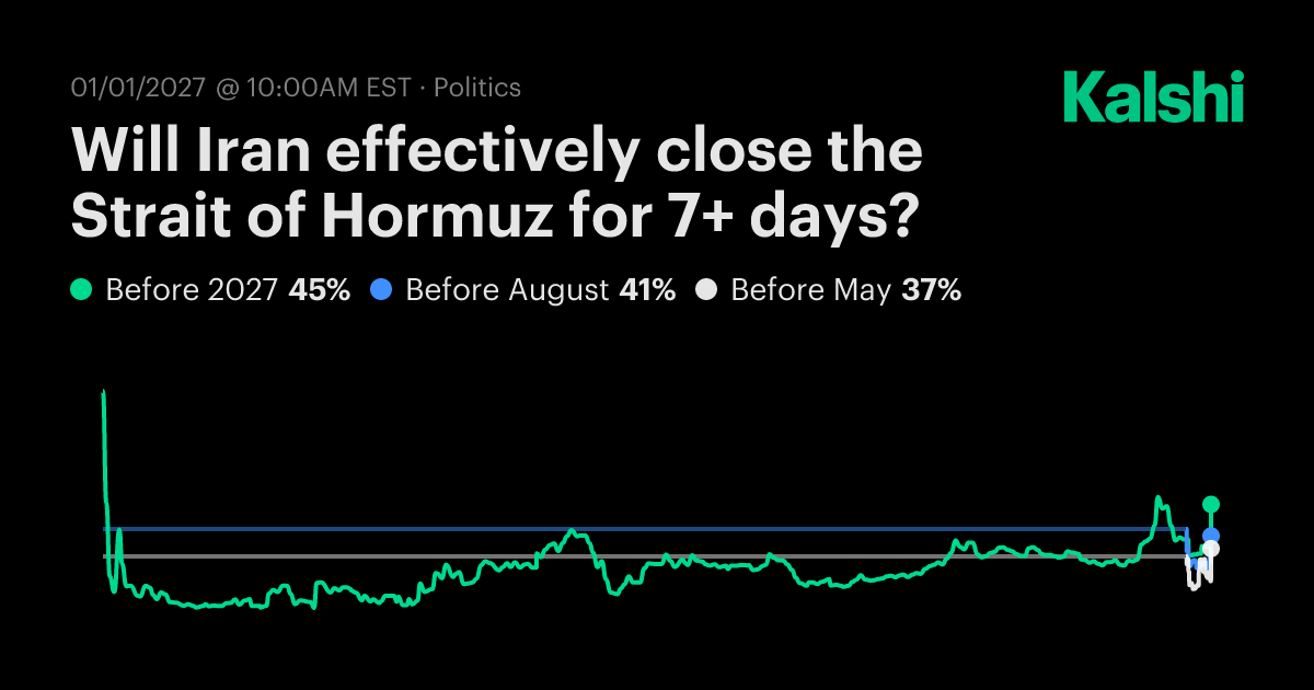 <Entity>), place (<Place>), and date (<Date>) are all filled in by the Exchange for each specific market iteration. You need to check the specific contract listing to see which waterway, which actor, and which deadline you're actually trading. These could be, for example, "the Strait of Hormuz," "Iran," and "December 31, 2026."The 90% threshold is steep. This is near-total closure. A situation where half the ships reroute but some still get through would resolve No. Even a dramatic 85% reduction resolves No.