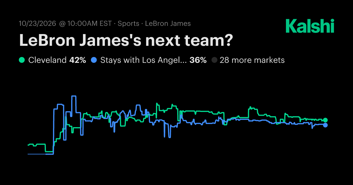Prediction market platform Kalshi currently reflects this reality. Cleveland leads with a YES bid of 41 cents per share, the Lakers sit second at a midpoint of 36.5 cents, and Golden State follows at a midpoint of 10.5 cents, with no verified market data available on a retirement outcome. James himself offered little clarity at All-Star Weekend, saying simply, "When I know, you guys will know."